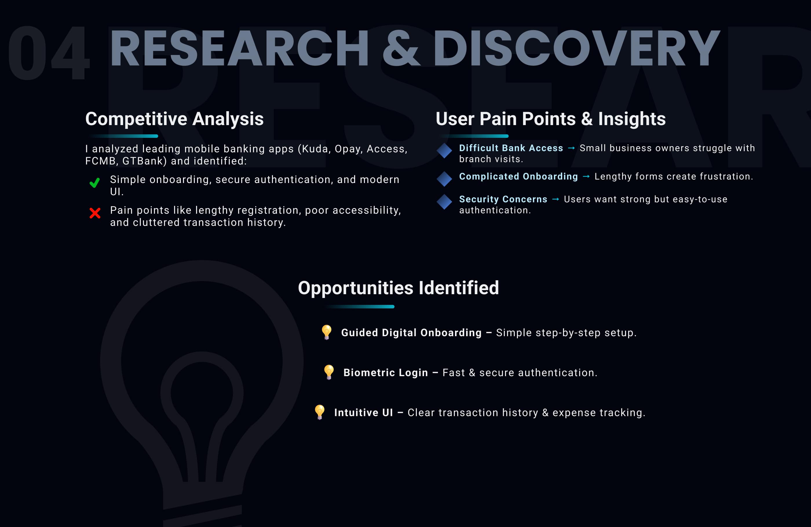 I analyzed several leading mobile banking apps such as Kuda, Opay, and GTBank to identify common pain points like complex onboarding and poor accessibility.