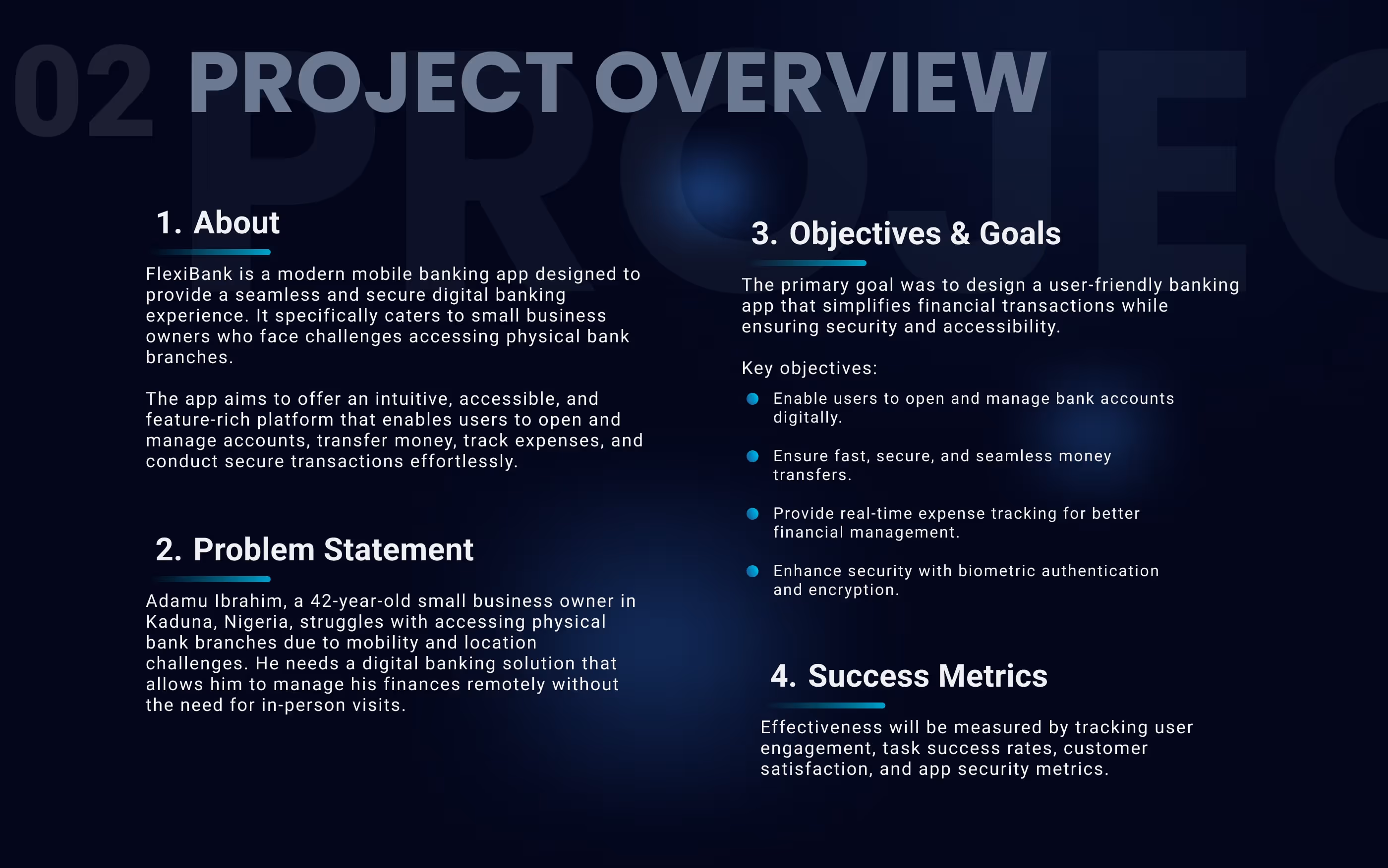 The project resulted in a complete UX case study demonstrating the full process—from user research to final prototype. FlexiBank successfully meets the goal of creating a secure, accessible, and efficient banking experience, tailored for users in Nigeria who need reliable financial tools on the go.