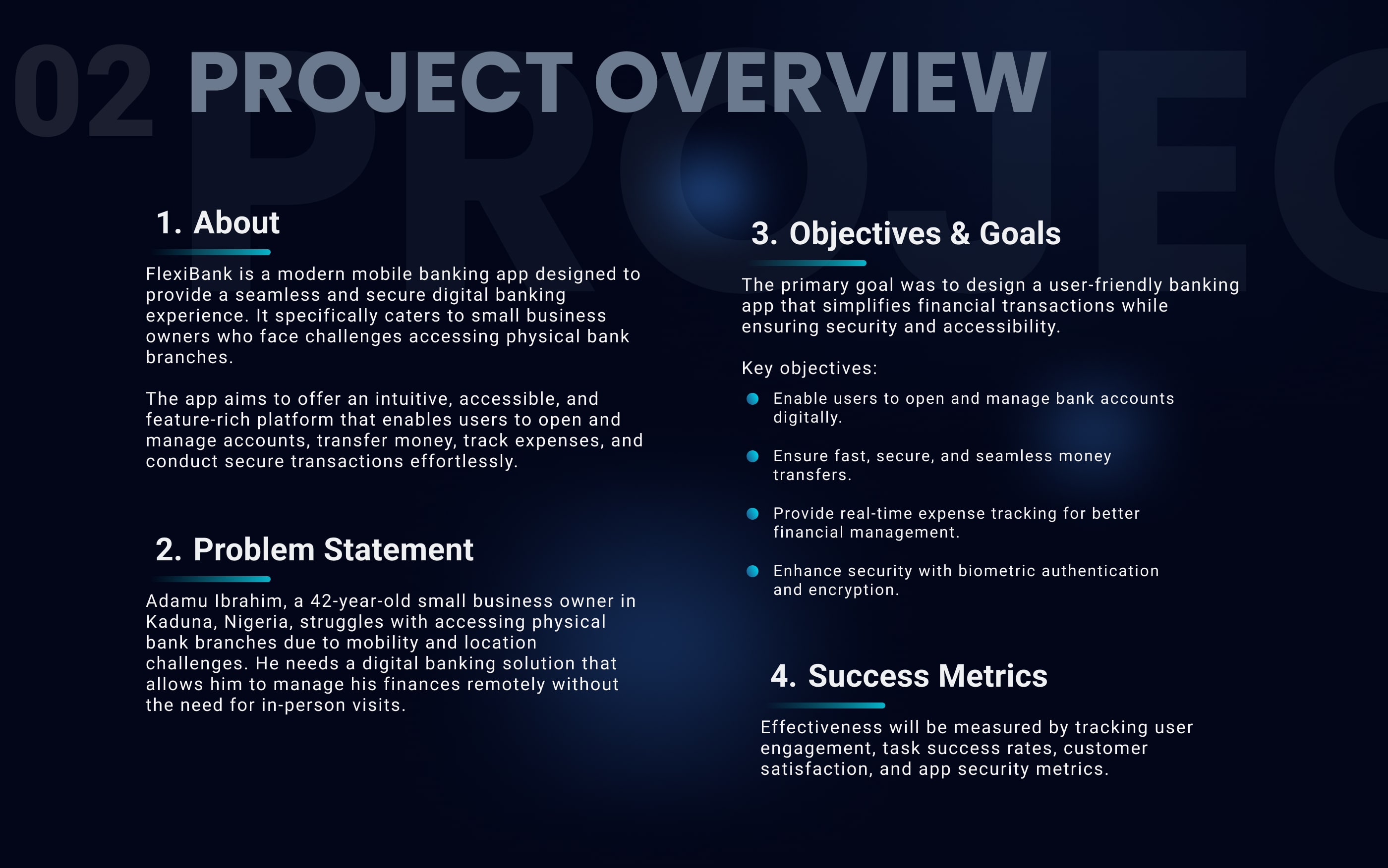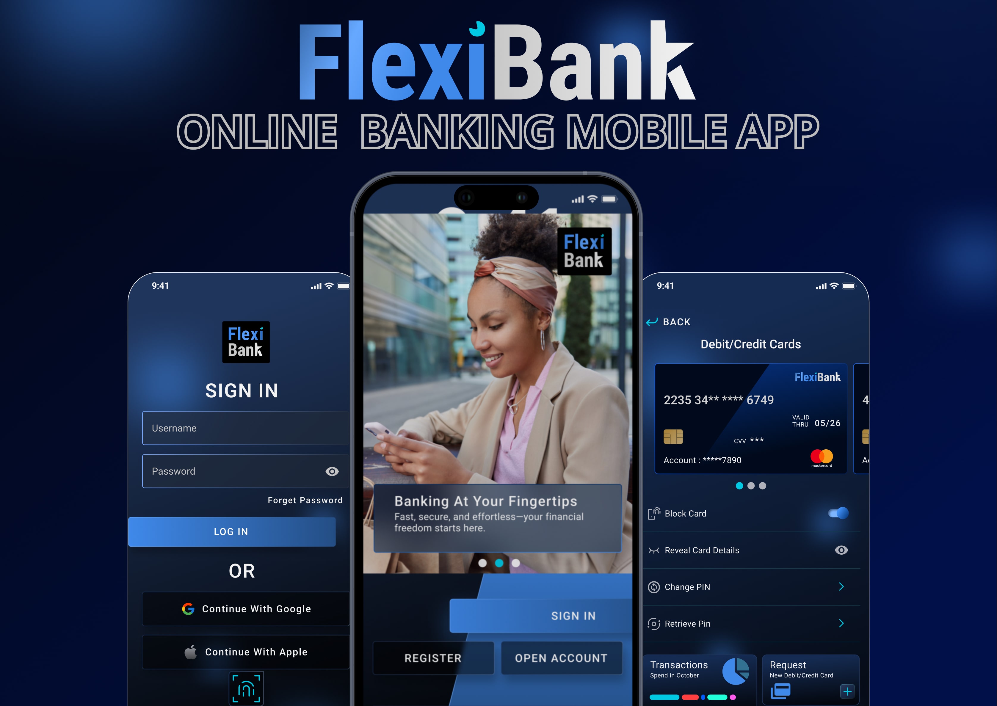 FlexiBank is a mobile banking app built to help users manage their finances digitally without needing to visit a physical branch. The goal was to create an intuitive and accessible platform for users—especially small business owners—who face mobility or location challenges. The app enables users to open and manage accounts, transfer money, track expenses, and secure transactions from anywhere, anytime.